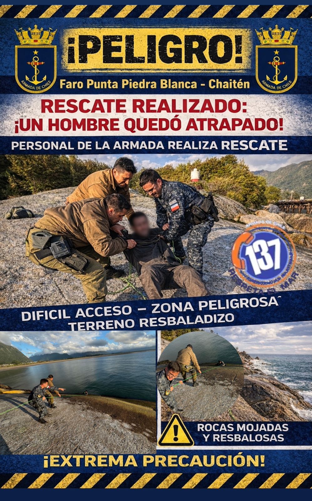 Personal de la Capitanía de Puerto de Chaitén, con apoyo de la 4ª Comisaría de Carabineros de Chaitén, rescató el domingo 30 de marzo a un hombre de 54 años que se había caído al mar en el sector del Faro Punta Piedra Blanca. El afectado fue encontrado aferrado a los roqueríos del lugar, fue evacuado con vida y trasladado al Hospital de Chaitén, desde donde fue dado de alta sin novedades.