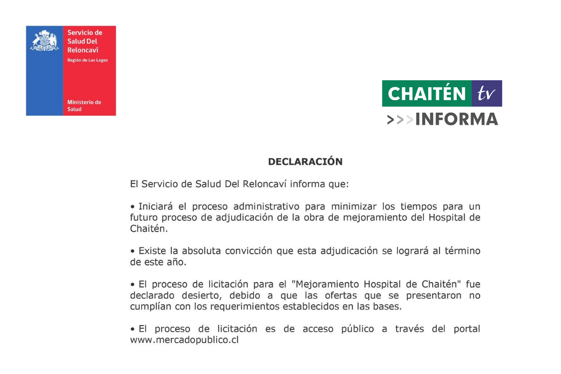 Tras, el comunicado con fecha 11 de agosto que informa la resolución del Servicio de Salud del Reloncaví «Declara Desierta la licitación» , que se llevaba en curso para el mejoramiento del actual hospital en chaitén.