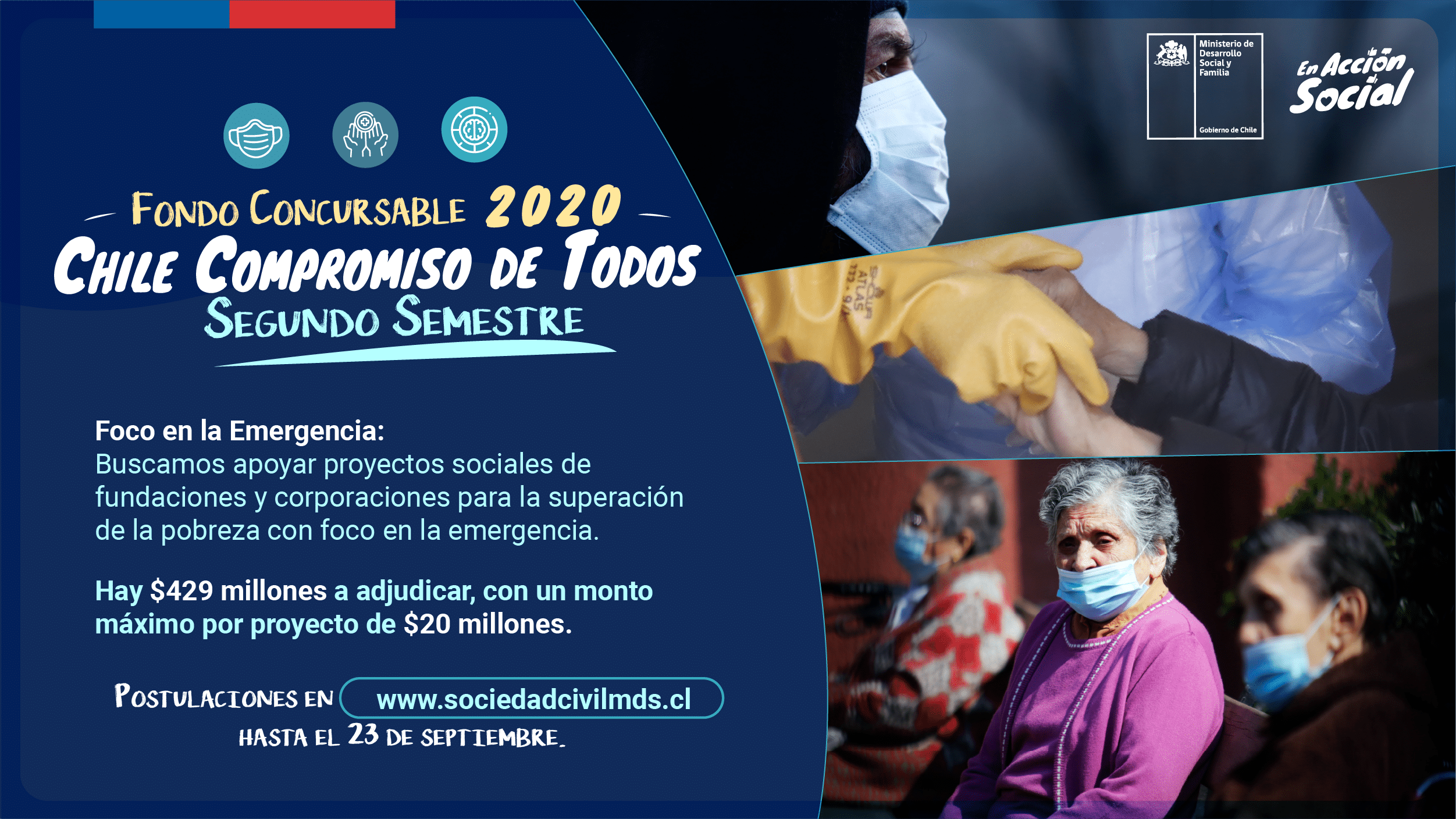 El Ministerio de Desarrollo Social y Familia comenzó un segundo proceso de postulación del Fondo Chile Compromiso de Todos y Todas que se suma al realizado en abril de este año. Este es un llamado excepcional que se llevará a cabo debido a la pandemia, con el objetivo de financiar proyectos innovadores de la sociedad civil comprometidos con la superación de la pobreza y vulnerabilidades durante la emergencia.