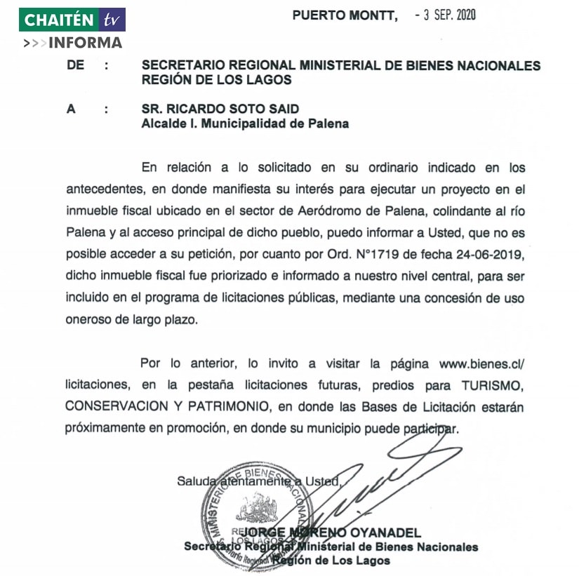 BIENES NACIONALES NO ENTREGARÁ TERRENO A PALENA