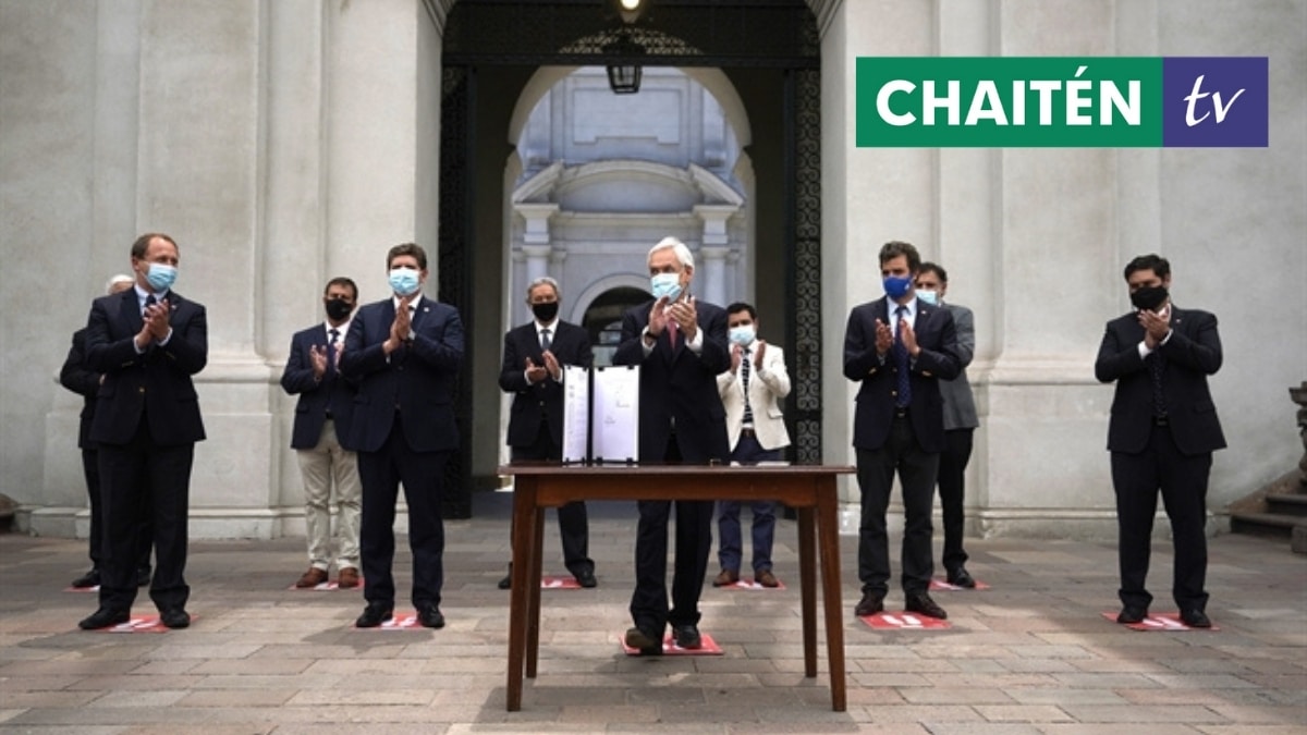 El Presidente de la República, Sebastián Piñera, acompañado por los ministros de Hacienda, Rodrigo Cerda; y de la Segpres, Juan José Ossa, promulga la ley que amplía los beneficios y usos del Fondo de Garantía para Pequeños y Medianos Empresarios (FOGAPE).
