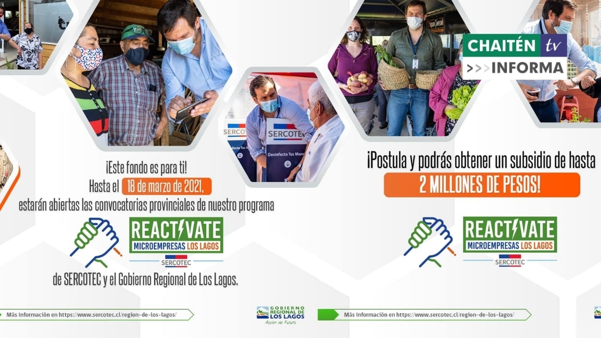 El programa Reactívate Microempresas región de Los Lagos, es un fondo no reembolsable de hasta $ 2.000.000 de pesos, que busca apoyar a las micro y pequeñas empresas de región, que tengan inicio de actividades en primera categoría hasta el 31 de diciembre de 2019 ante el SII; con ventas netas mayores o iguales a 40 UF e inferiores o iguales a 2.400 UF al año, que hayan visto afectadas sus ventas en al menos un 5%, producto de la emergencia sanitaria.