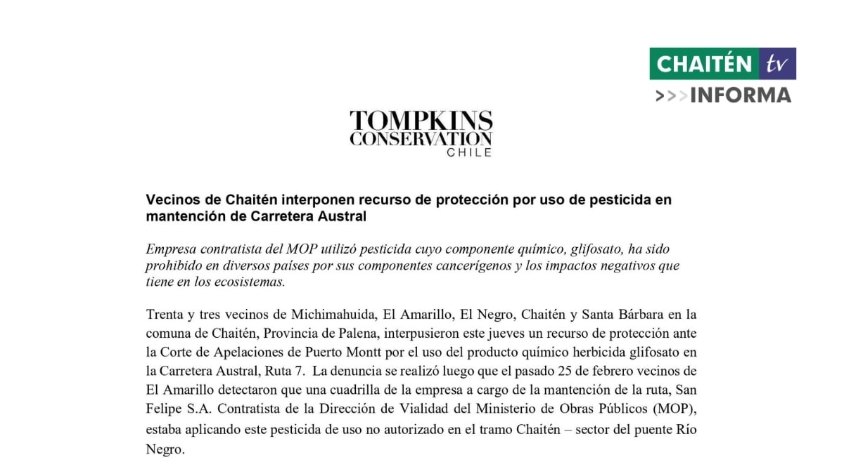 En un comunicado entregado hoy por Tompkins Conservation Chile, donde señala que 33 vecinos y vecinas de los sectores de Michimahuida, El Amarillo, El Negro, Chaitén y Santa Bárbara en la comuna de Chaitén, Provincia de Palena, interpusieron este jueves un recurso de protección ante la Corte de Apelaciones de Puerto Montt por el uso del producto químico herbicida glifosato en la Carretera Austral, Ruta 7. La denuncia se realizó luego que el pasado 25 de febrero vecinos de El Amarillo detectaron que una cuadrilla de la empresa a cargo de la mantención de la ruta, San Felipe S.A. Contratista de la Dirección de Vialidad del Ministerio de Obras Públicos (MOP), estaba aplicando este pesticida de uso no autorizado en el tramo Chaitén – sector del puente Río Negro. Declaración