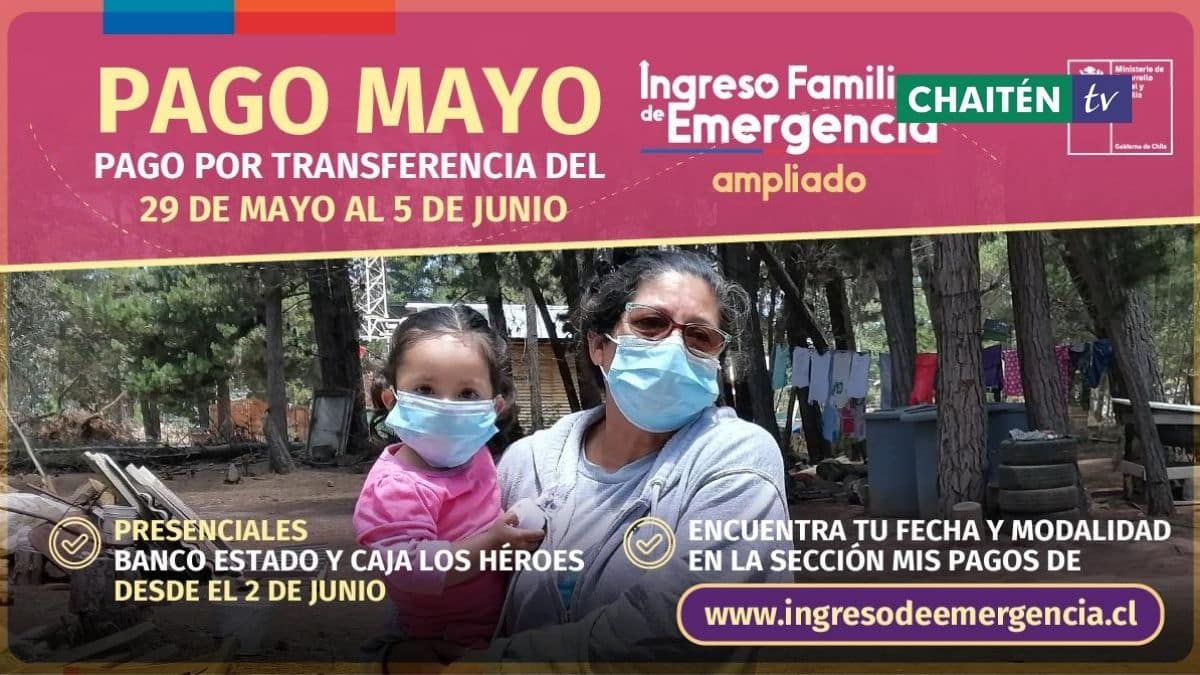 Los pagos en línea para los beneficiarios del IFE Ampliado de mayo, se realizarán entre el sábado 29 de mayo y el martes 8 junio, mientras que los pagos presenciales están contemplados a partir del 2 de junio en las sucursales de Banco Estado y Caja los Héroes. Consulta por tu fecha y modalidad de pago del IFE Ampliado de mayo en la sección “Mis Pagos” en www.ingresodeemergencia.cl