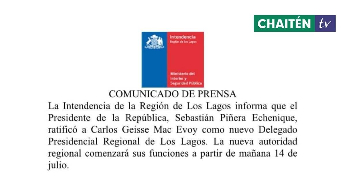 La Intendencia de la Región de Los Lagos informa que el Presidente de la República, Sebastián Piñera Echenique, ratificó a Carlos Geisse Mac Evoy como nuevo Delegado Presidencial Regional de Los Lagos. La nueva autoridad regional comenzará sus funciones a partir del 14 de julio.