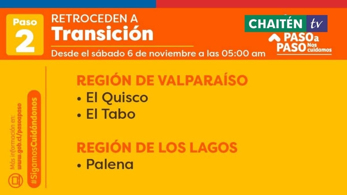 Tal como se comunicó hoy el Ministerio de Salud entrego nuevos detalles del Plan Paso a Paso. En lo que se confirmó que la comuna de Palena retrocede a Transición desde el día sábado 06 de noviembre a contar de las 05:00 horas, se unen a esta medida las comunas de El Quisco y El Tabo de la región de Valparaíso, únicas tres comunas a nivel nacional