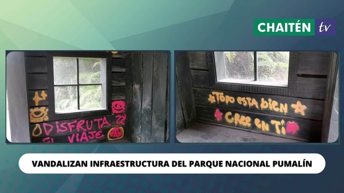 Otro hecho de vandalismo se observó hoy en una caseta de descanso, infraestructura que está en el Parque Nacional Pumalín Douglas Tompkins, se observan rayados con frases, el hecho causo indignación entre las personas que transitan por el lugar, ya que hechos como este se están volviendo recurrentes, recordar que meses antes, personas realizaron un tallado en un Alerce Milenario, en otro hecho delictual personas sustrajeron dispensadores de los baños del Parque Nacional Pumalín Douglas Tompkins y hace semanas atrás a dos turistas se les expulso de otro parque por realizar fogatas en lugares no autorizados.