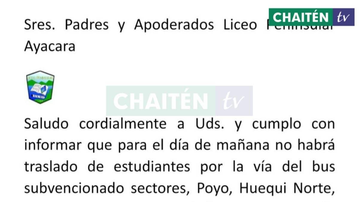El Liceo Peninsular Ayacara, informa por medio de un comunicado, que mañana no habrá traslado de estudiantes por vía del bus, el cual es subvencionado, por no contar con chofer, los sectores afectados son Huequi, Quetre, Poyo y Chulao.