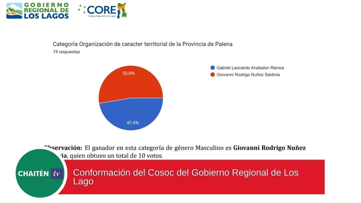 El pasado 11 de noviembre de 2024, se realizó la votación del COSOC de Los Lagos, obteniendo una alta participación de la sociedad civil organizada. El COSOC es un organismo democrático que busca fortalecer la relación entre el Estado y la ciudadanía en el seguimiento de políticas públicas. Giovanni Nuñez, con 10 votos, fue electo en la categoría masculina, mientras que Claudia Vargas recibió 7 votos en la categoría femenina. Un video de agradecimiento de Giovanni Nuñez, representante de Chaitén, se encuentra disponible. Además, el acta completa con los resultados a nivel regional puede descargarse en formato PDF.