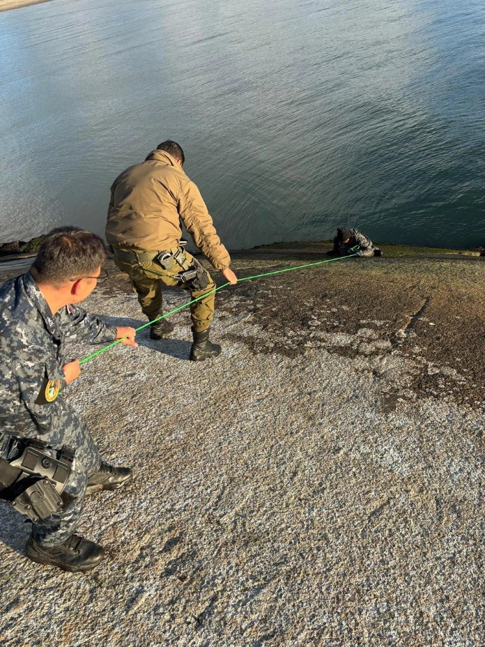 El procedimiento se inició tras un llamado telefónico recibido en la Capitanía que informaba de una persona en el agua en ese sector de la costa. Los funcionarios se trasladaron de inmediato al lugar y constataron que el hombre aún se sostenía en los roqueríos, evitando caer nuevamente al mar.